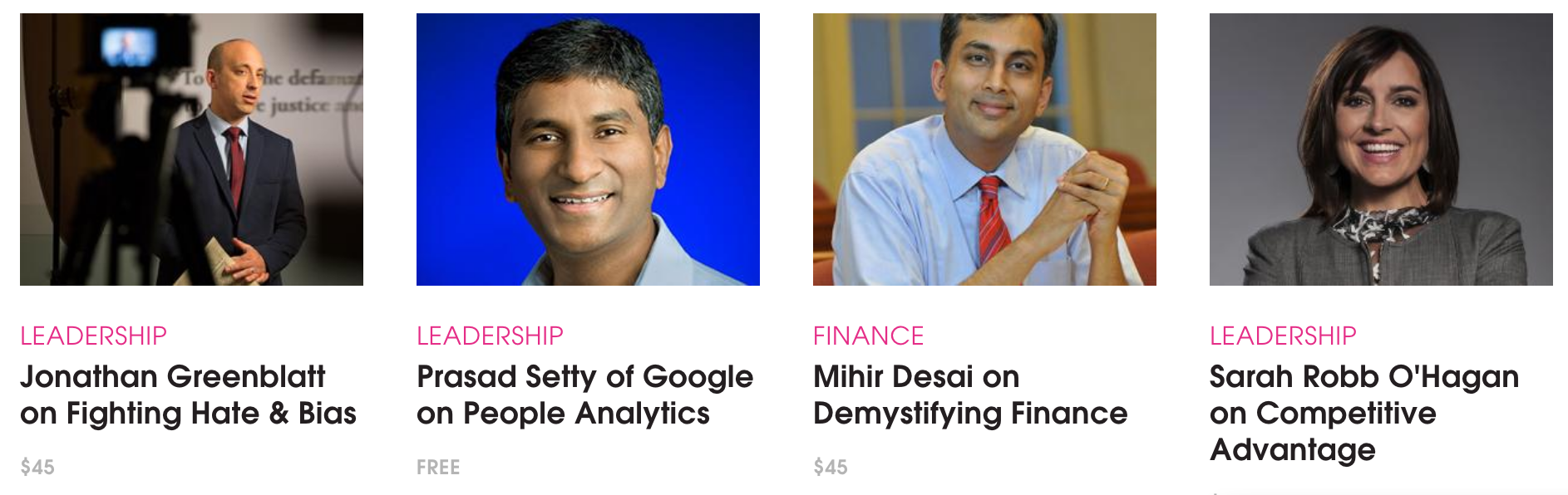 Five video-based courses taught by Debbie Millman, Sarah Robb O'Hagan, Mihir Desai, Prasad Setty and Jonathan Greenblatt, published on Udemy and Teachable and distributed through the +Acumen website.