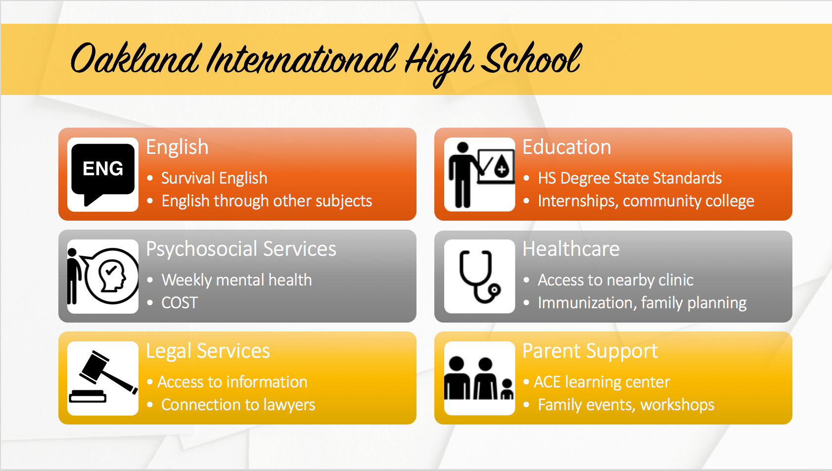 The Oakland International High School (OIHS) has taken on this challenge, serving as a hub for social service providers, fostering community development and providing educational and emotional support for newcomer students. Nevertheless, the school has expressed difficulty in having Central American students attend on a regular basis, therefore limiting the impact of their efforts, the state and federal funding.